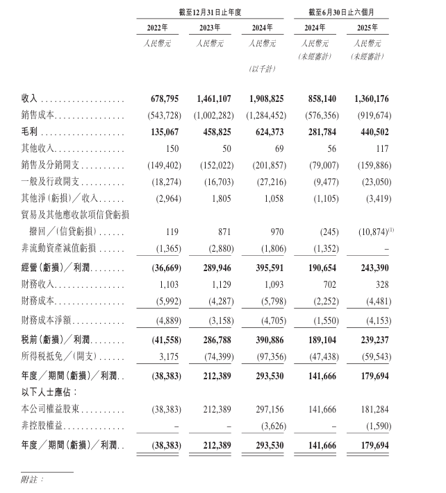 财务数据显示,TOP TOY在过去三年显示出增长趋势。其收入由2022年的6.79亿元增加至2024年的19.09亿元,复合年增长率为67.7%,并由2024 年上半年的8.58亿元增加至2025年上半年的13.6亿元。不过利润方面,2022年净亏损3838万元,2023年净利润为2.12亿元,2024年净利润达2.94亿元,今年上半年为17.97亿元。